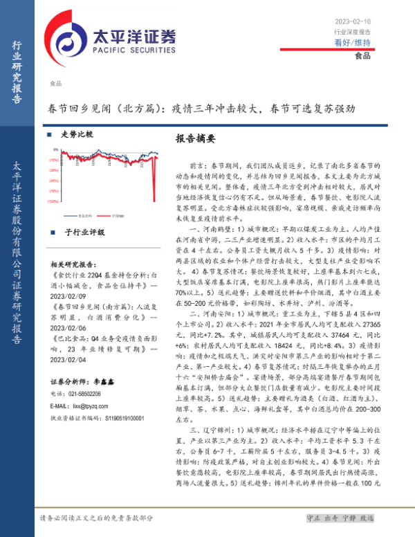 【太平洋证券】【20230210】20230210-太平洋-食品行业深度报告:春节回乡见闻(北方篇):疫情三年冲击较大,春节可选复苏强劲-19页 行业研究