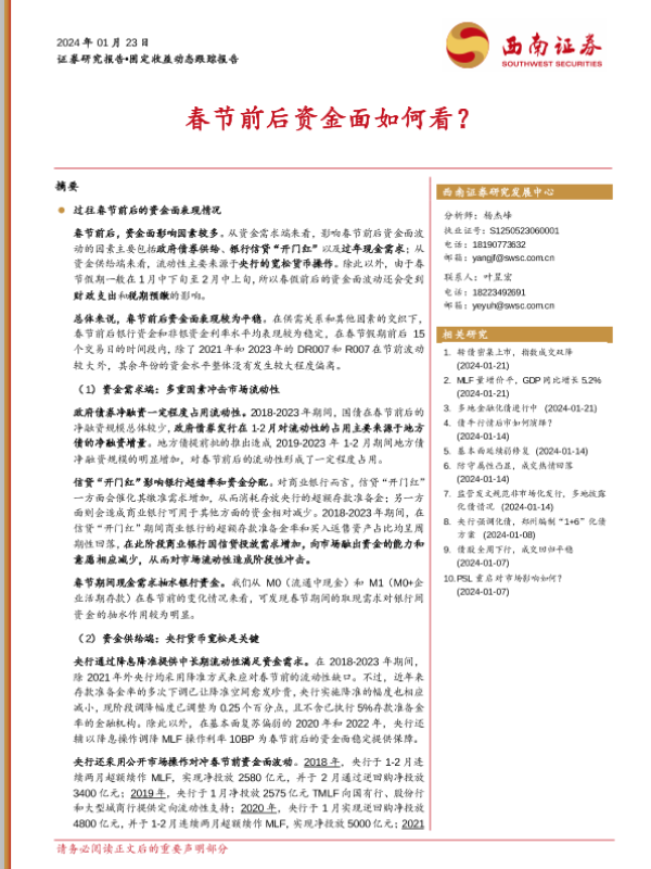 【西南证券】【20240123】固定收益动态跟踪报告:春节前后资金面如何看?-15页 行业研究