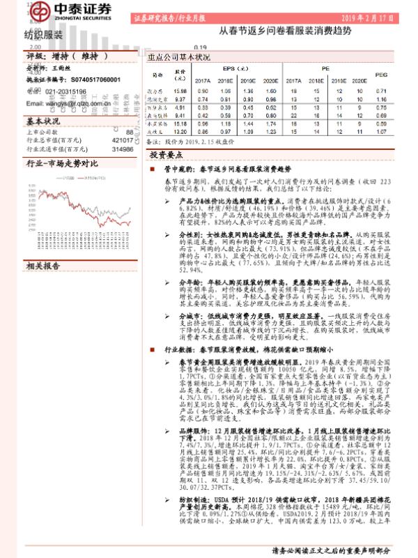 【中泰证券】【20190217】20190217-中泰证券-纺织服装行业月报:从春节返乡问卷看服装消费趋势-20页 行业研究