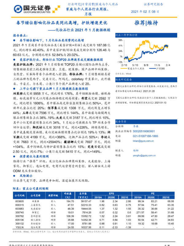 【国元证券】【20210208】化妆品行业2021年1月数据跟踪:春节错位影响化妆品类同比高增,护肤增速更优-6页 行业研究