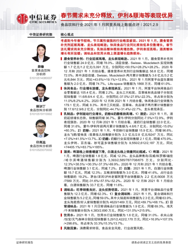 【中信证券】【20210209】食品饮料行业2021年1月阿里系线上数据点评:春节需求未充分释放,伊利&颐海等表现优异-11页 行业研究