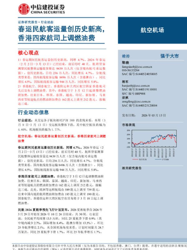 【中信建投证券】【202603】春运民航客运量创历史新高,香港四家航司上调燃油费-21页 证券期货研究报告