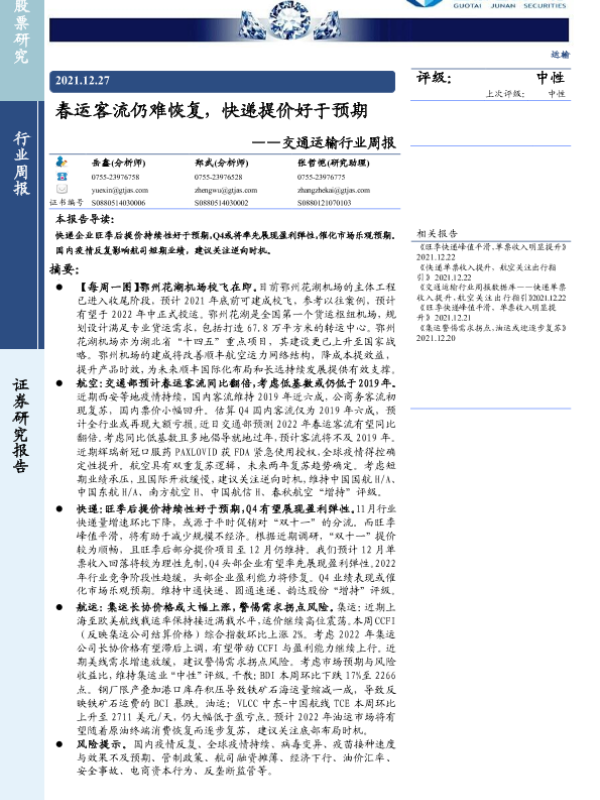 【国泰君安证券】【20211227】交通运输行业周报:春运客流仍难恢复,快递提价好于预期-12页 行业研究
