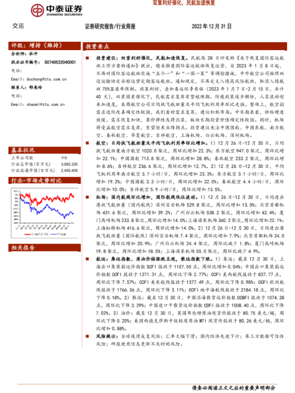 【中泰证券】【20221231】交运行业周报:双重利好催化,民航加速恢复-36页 行业研究