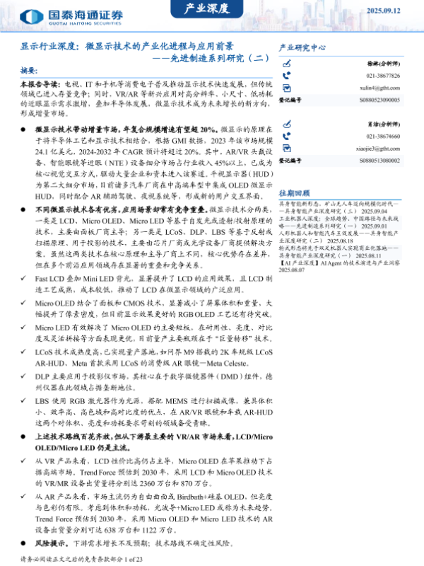 【国泰海通证券】【202509】显示行业深度:微显示技术的产业化进程与应用前景——先进制造系列研究(二)-23页 证券期货研究报告