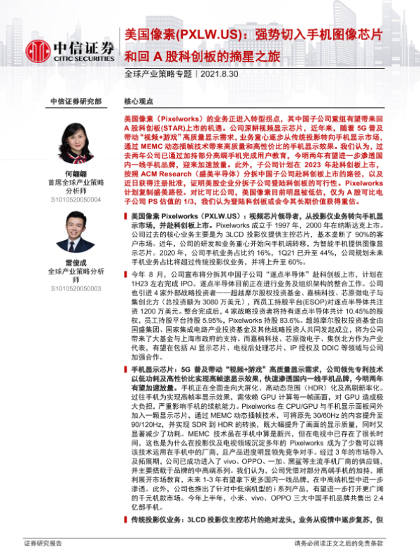 【中信证券】【20210830】全球产业策略专题:美国像素(PXLW.US),强势切入手机图像芯片和回A股科创板的摘星之旅-28页 行业研究