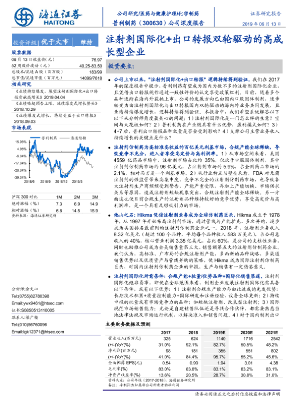 【海通证券】【20190613】20190613-海通证券-普利制药-300630.SZ-公司深度报告:注射剂国际化+出口转报双轮驱动的高成长型企业-26页 行业研究