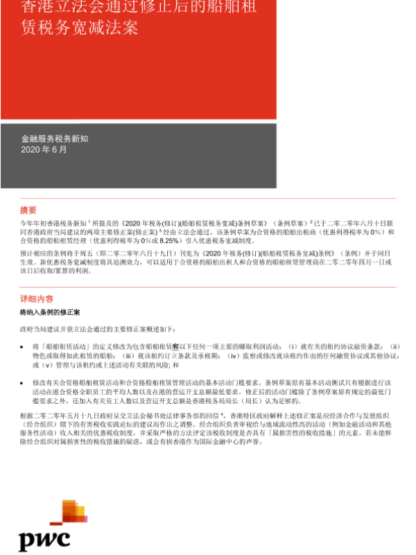 【普华永道中天会计师事务所】【202006】香港立法会通过修正后的船舶租赁税务宽减法案-3页 政策文件