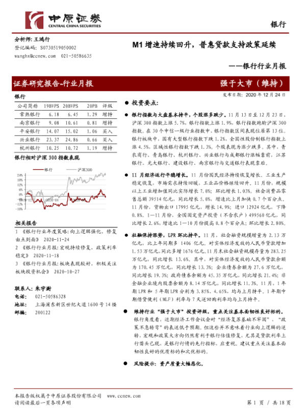 【中原证券】【20201224】银行行业月报:M1增速持续回升,普惠贷款支持政策延续-18页 行业研究