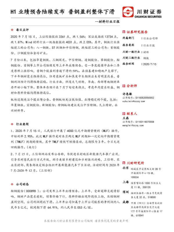 【川财证券】【20200715】材料行业日报:H1业绩预告陆续发布 普钢盈利整体下滑-3页 证券期货研究报告