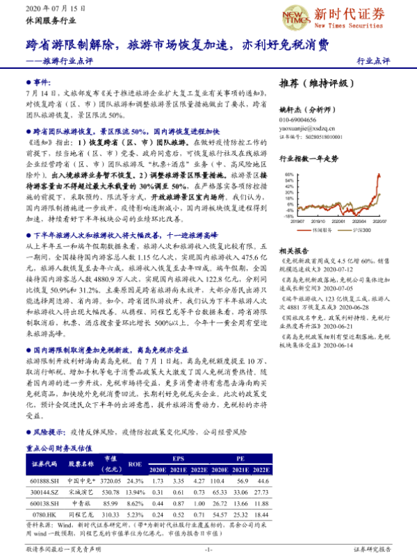 【新时代证券】【20200715】跨省游限制解除,旅游市场恢复加速,亦利好免税消费-3页 行业研究