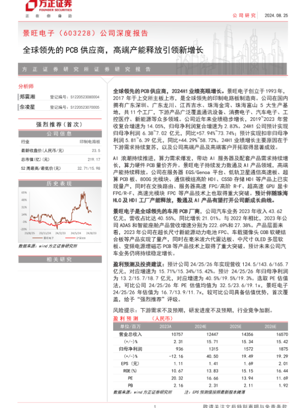 【方正证券】【20240825】景旺电子(603228)公司深度报告:全球领先的PCB供应商,高端产能释放引领新增长-23页 公司研究