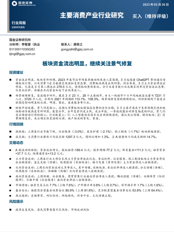 【国金证券】【20230326】主要消费产业行业研究周报:板块资金流出明显,继续关注景气修复-19页 行业研究