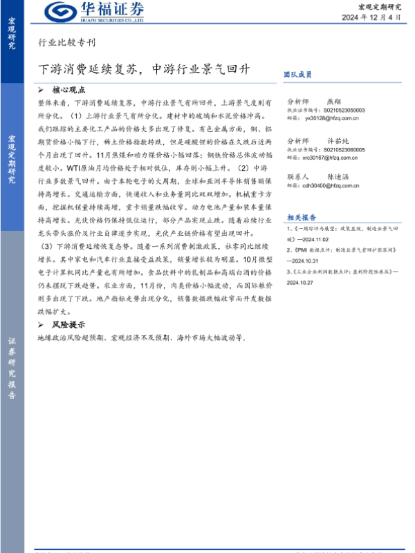 【华福证券】【20241204】行业比较专刊:下游消费延续复苏,中游行业景气回升-20页 行业研究