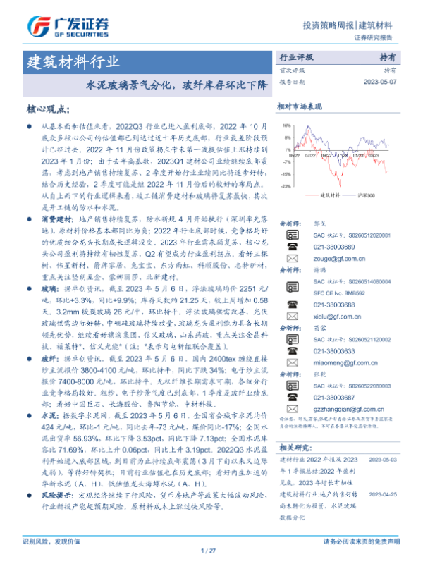 【广发证券】【20230507】建筑材料行业投资策略周报:水泥玻璃景气分化,玻纤库存环比下降-27页 行业研究
