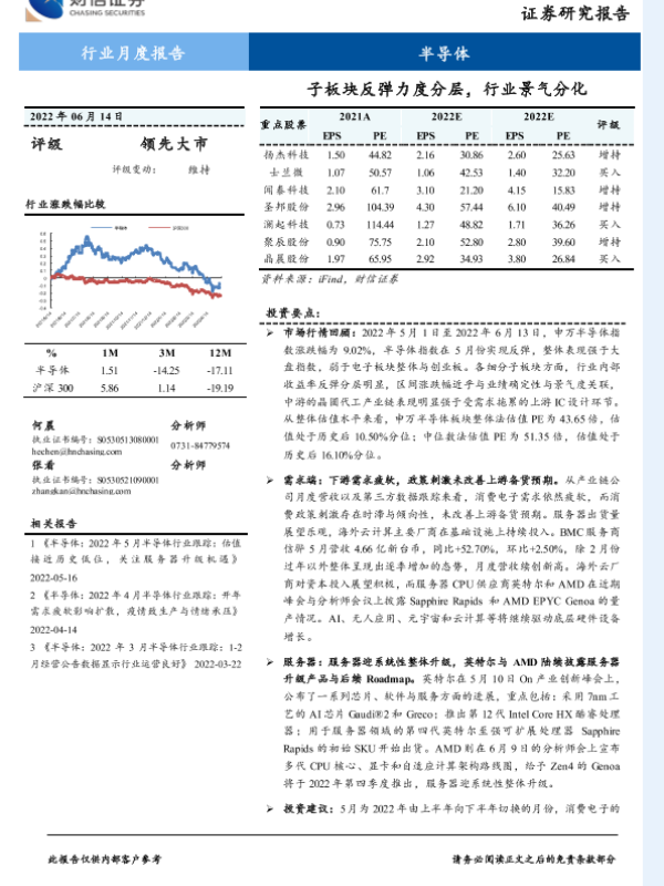 【财信证券】【20220614】半导体行业月度报告:子板块反弹力度分层,行业景气分化-11页 行业研究
