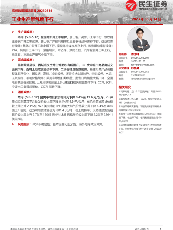 【民生证券】【20230415】高频数据跟踪周报:工业生产景气度下行-18页 行业研究
