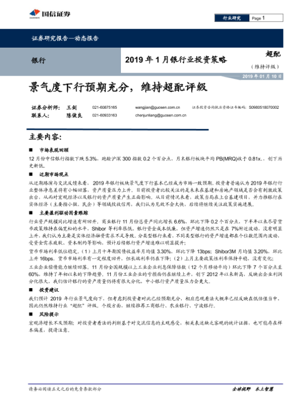 【国信证券】【20190110】银行2019年1月银行业投资策略-7页 行业研究