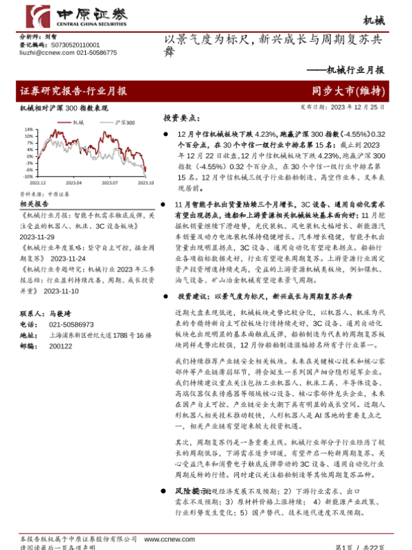 【中原证券】【20231225】机械行业月报:以景气度为标尺,新兴成长与周期复苏共舞-22页 行业研究