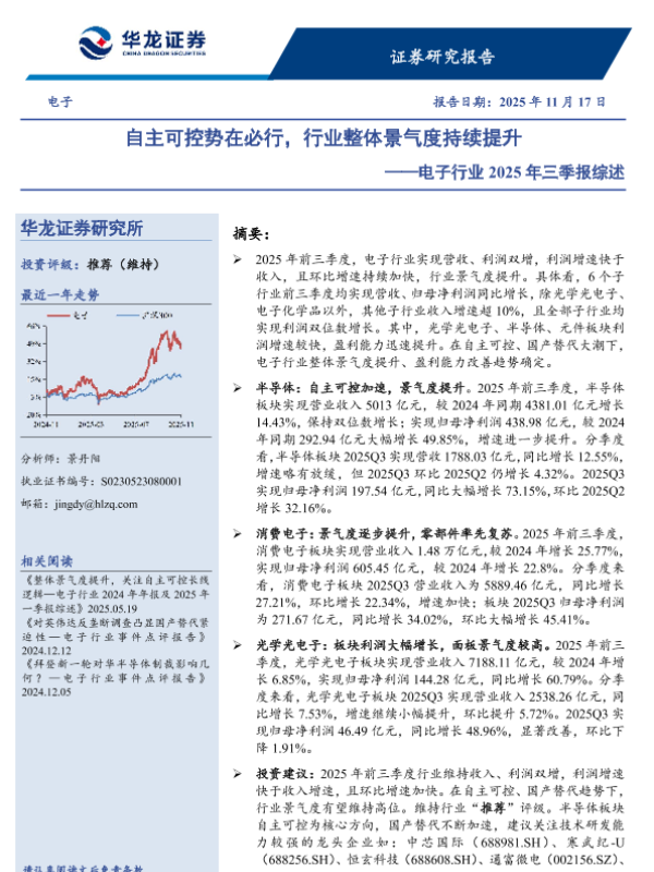 【华龙证券】【202511】电子行业2025年三季报综述:自主可控势在必行,行业整体景气度持续提升-22页 证券期货研究报告