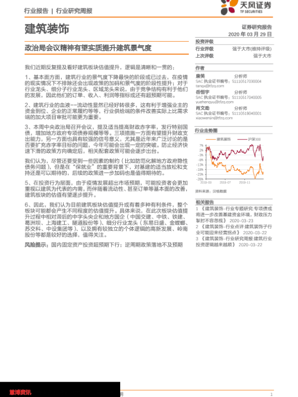 【天风证券】【20200329】建筑装饰行业研究周报:政治局会议精神有望实质提升建筑景气度-2页 行业研究