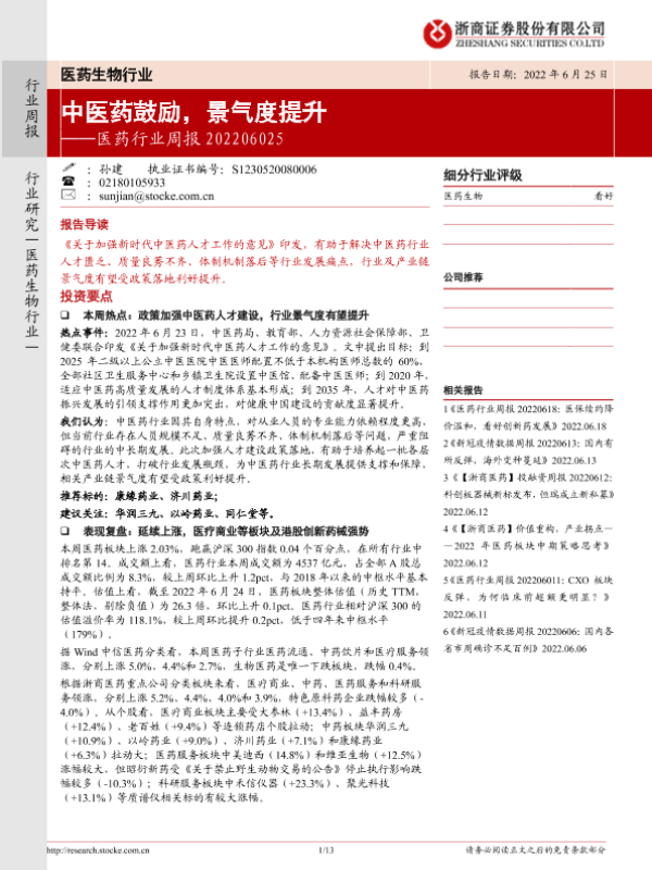 【浙商证券】【20220625】医药行业周报:中医药鼓励,景气度提升-13页 行业研究