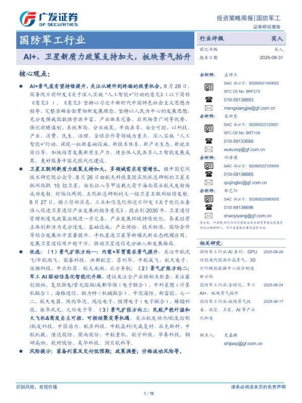 【广发证券】【202508】国防军工行业:AI+、卫星新质力政策支持加大,板块景气抬升-19页 证券期货研究报告