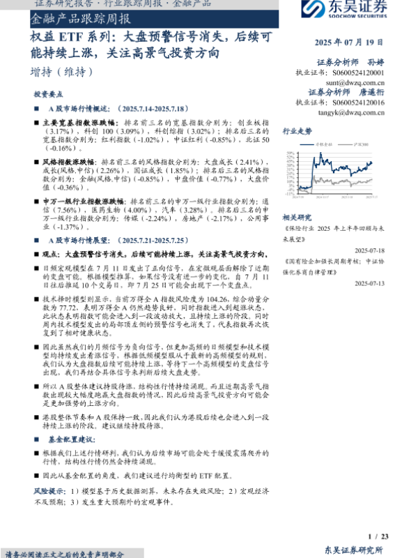 【东吴证券】【20250719】金融产品跟踪周报:权益ETF系列:大盘预警信号消失,后续可能持续上涨,关注高景气投资方向-23页 证券期货研究报告