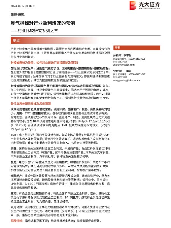 【光大证券】【20241216】行业比较研究系列之三:景气指标对行业盈利增速的预测-23页 行业研究