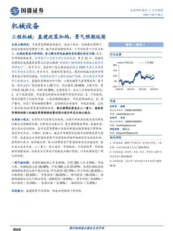 【国盛证券】【20190908】20190908-国盛证券-机械设备行业周报:工程机械:基建政策加码,景气预期延续-14页 行业研究