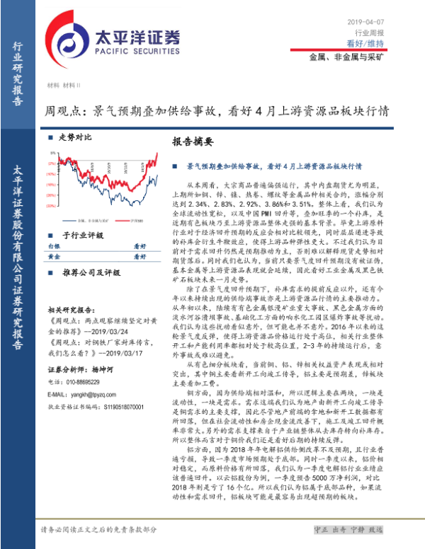 【太平洋证券】【20190407】20190407-太平洋-金属、非金属与采矿周观点:景气预期叠加供给事故,看好4月上游资源品板块行情-4页 行业研究