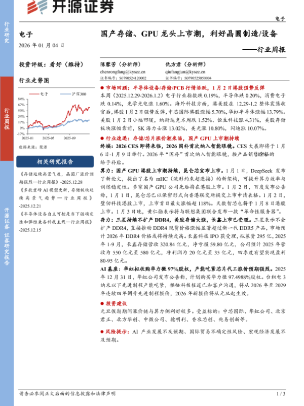 【开源证券】【202601】国产存储、GPU龙头上市潮,利好晶圆制造/设备-3页 证券期货研究报告