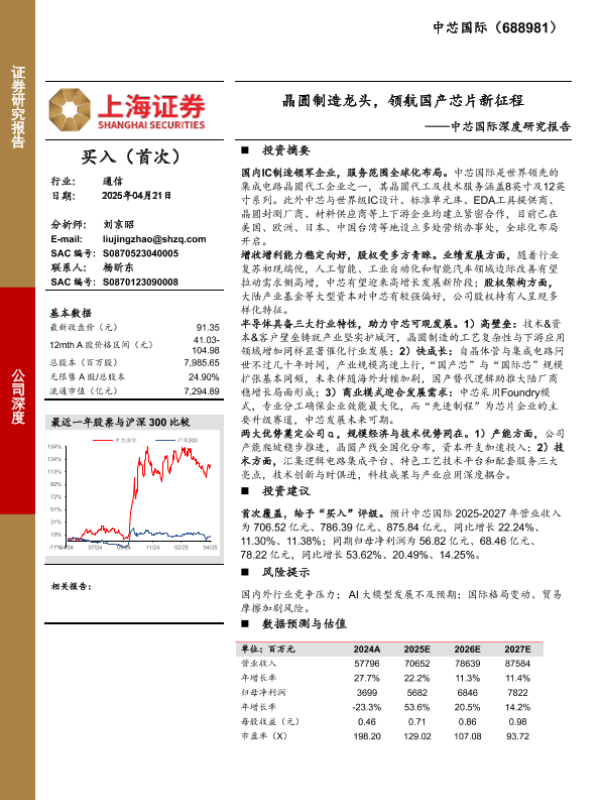 【上海证券】【20250421】中芯国际(688981)深度研究报告:晶圆制造龙头,领航国产芯片新征程-29页 证券期货研究报告