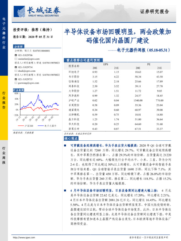 【长城证券】【20200531】20200531-长城证券-电子元器件周报:半导体设备市场回暖明显,两会政策加码催化国内晶圆厂建设-21页 行业研究