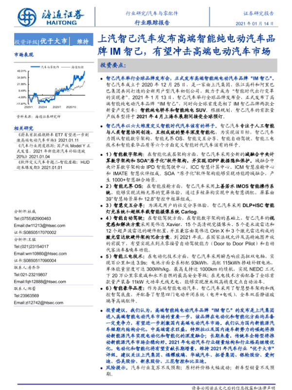 【海通证券】【20210114】汽车与零配件行业跟踪报告:上汽智己汽车发布高端智能纯电动汽车品牌IM智己,有望冲击高端电动汽车市场-4页 行业研究