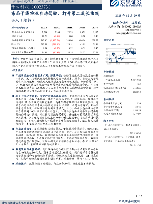 【东吴证券】【202512】布局干线物流自动驾驶,打开第二成长曲线-3页 证券期货研究报告
