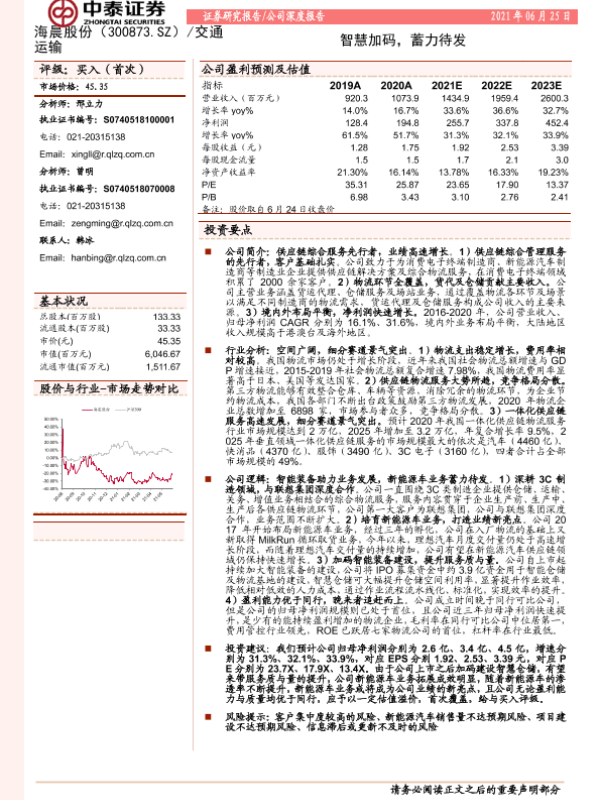 【中泰证券】【20210625】20210625-中泰证券-海晨股份-300873.SZ-智慧加码,蓄力待发-29页 行业研究