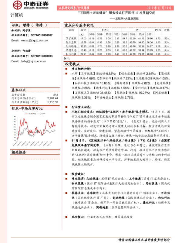 【中泰证券】【20191110】互联网+大健康周报:“互联网+老年健康”服务模式打开医疗IT发展新空间-13页 行业研究