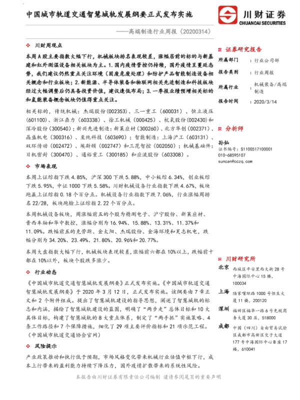 【川财证券】【20200314】20200314-川财证券-高端制造行业周报:中国城市轨道交通智慧城轨发展纲要正式发布实施-9页 行业研究