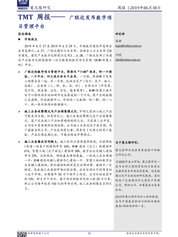 【莫尼塔研究】【20190630】TMT周报:广联达发布数字项目管理平台-6页 行业研究