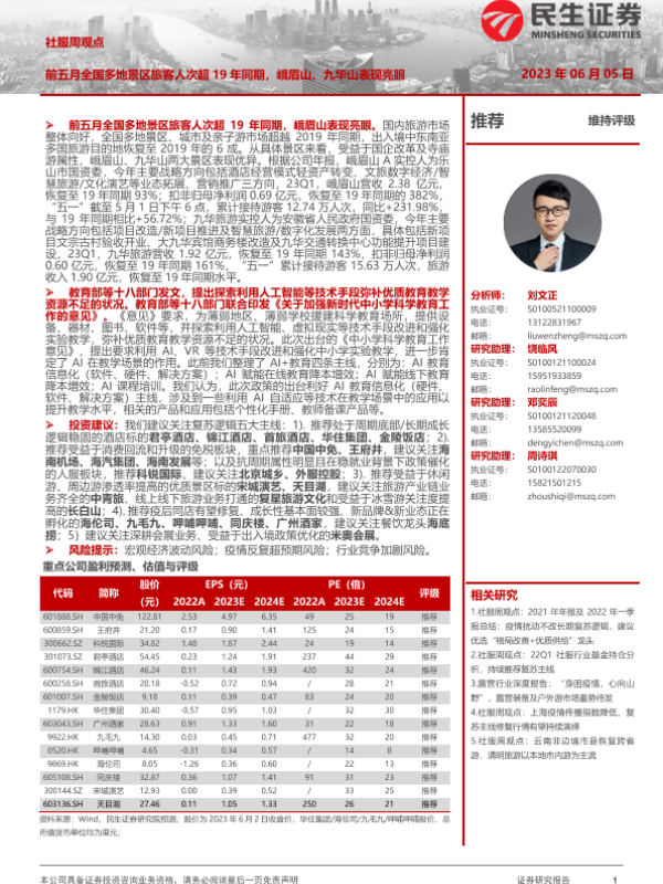 【民生证券】【20230605】社服周观点:前五月全国多地景区旅客人次超19年同期,峨眉山、九华山表现亮眼-24页 行业研究