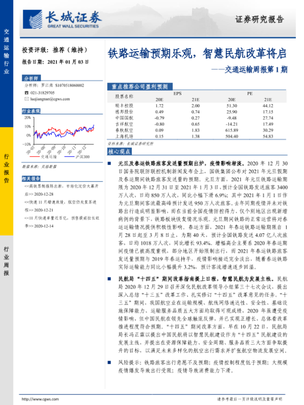 【长城证券】【20210103】交通运输周报第1期:铁路运输预期乐观,智慧民航改革将启-20页 行业研究