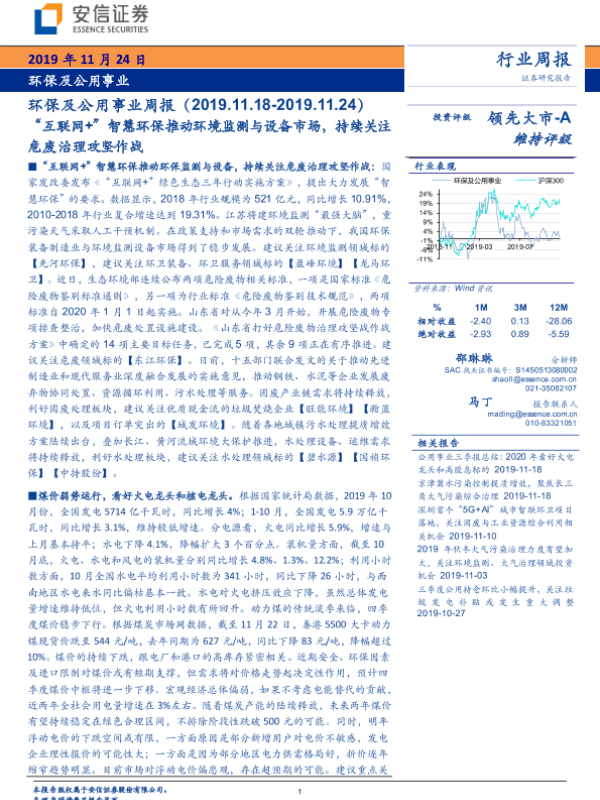 【安信证券】【20191124】环保及公用事业周报:“互联网+”智慧环保推动环境监测与设备市场,持续关注危废治理攻坚作战-19页 行业研究