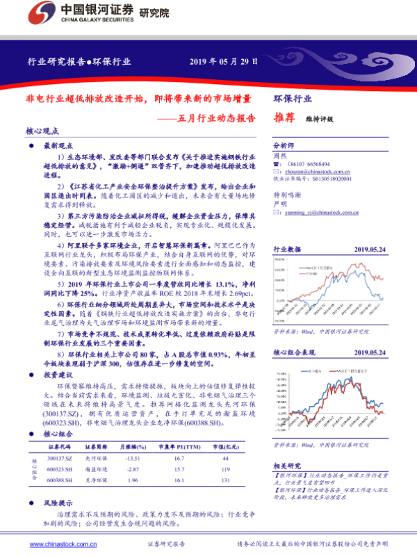 【银河证券】【20190529】环保行业五月份行业动态报告:非电行业超低排放改造开始,即将带来新的市场增量-26页 行业研究