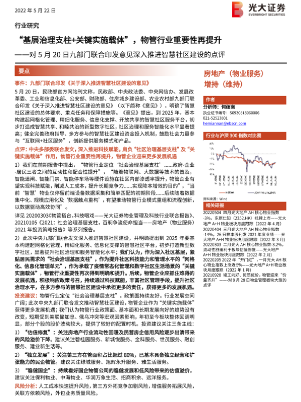 【光大证券】【20220522】物管行业重要性再提升:对九部门联合印发意见深入推进智慧社区建设的点评-2页 行业研究