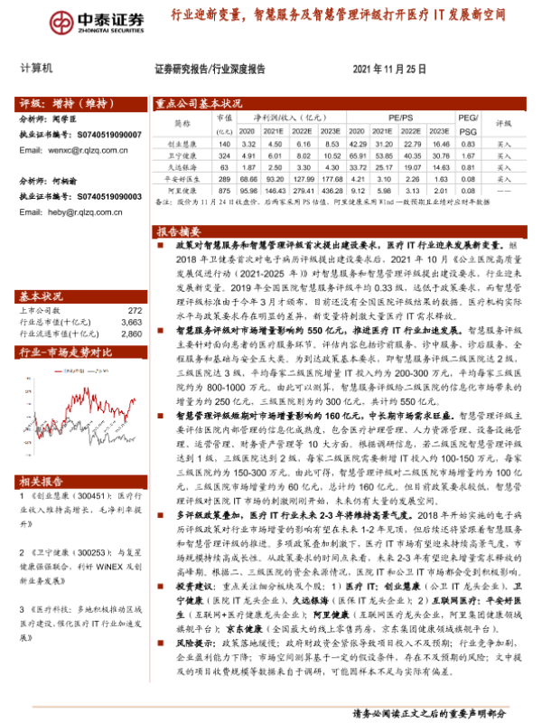 【中泰证券】【20211125】20211125-中泰证券-计算机行业深度报告:行业迎新变量,智慧服务及智慧管理评级打开医疗IT发展新空间-20页 行业研究