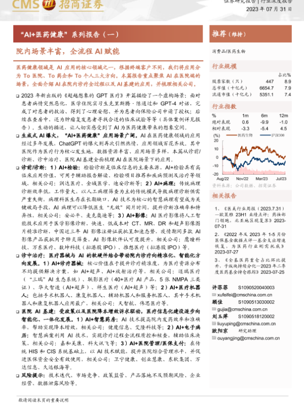 【海通证券】【20230731】医药生物行业“AI+医药健康” 系列报告(一):院内场景丰富,全流程AI赋能-31页 行业研究