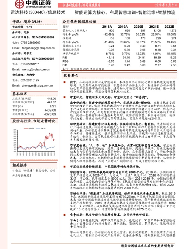 【中泰证券】【20200609】20200609-中泰证券-运达科技-300440.SZ-智能运算为核心,布局智慧培训+智能运维+智慧物流-32页 行业研究