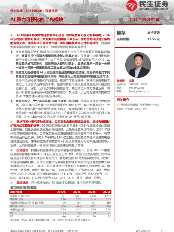 【民生证券】【20230801】恒为科技深度报告(603496):AI算力可视化的“光模块”-39页 行业研究