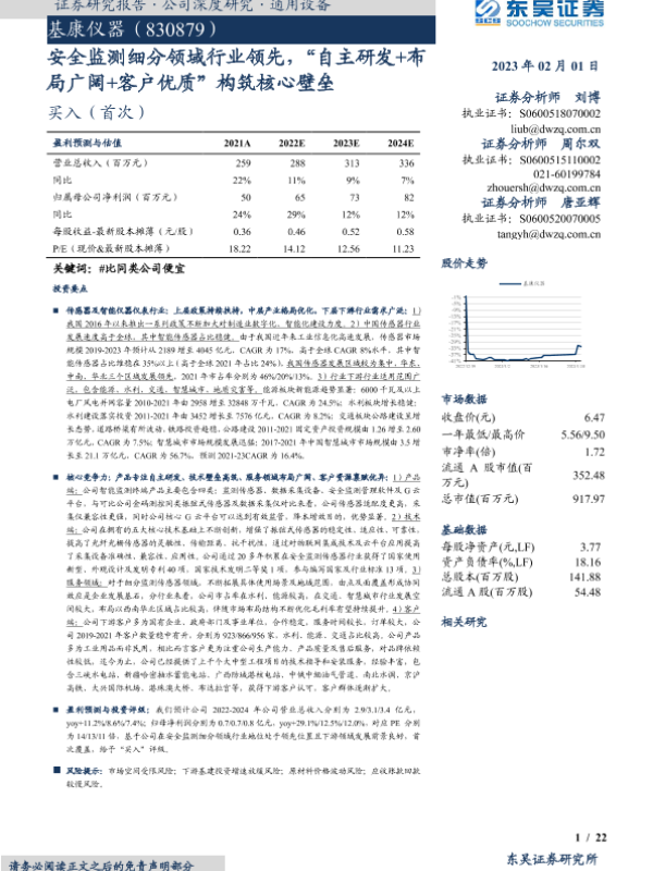 【东吴证券】【20230201】基康仪器(830879)安全监测细分领域行业领先,“自主研发+布局广阔+客户优质”构筑核心壁垒-22页 行业研究